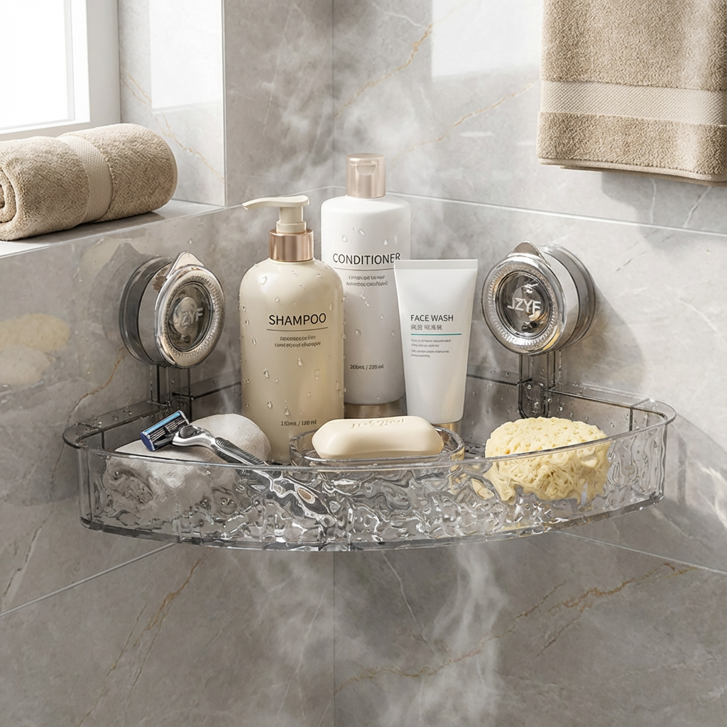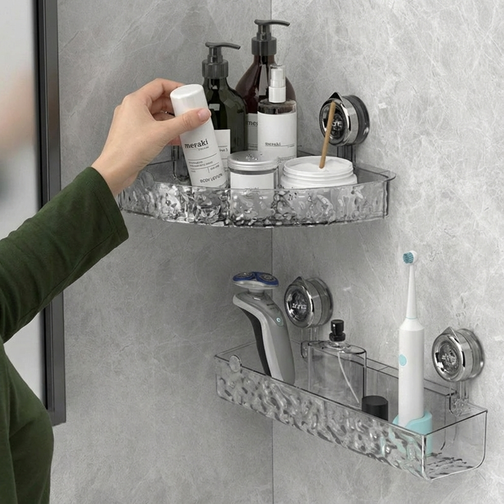 Med badrumshörnregalet med sugkoppar håller du alla dina hygienprodukter prydligt organiserade och alltid nära till hands – perfekt för ett stilrent och modernt badrum.