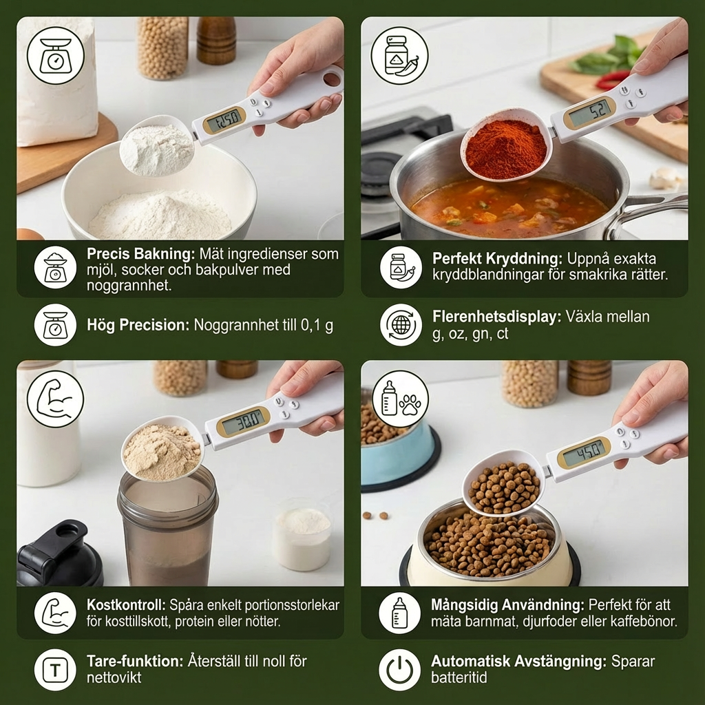 Den digitala mätskeden är utformad för att göra mätning av ingredienser så enkel och exakt som möjligt. Oavsett om du provar ett nytt recept eller behöver perfekta mängder till dina favoriträtter – ger denna sked alltid exakta resultat.