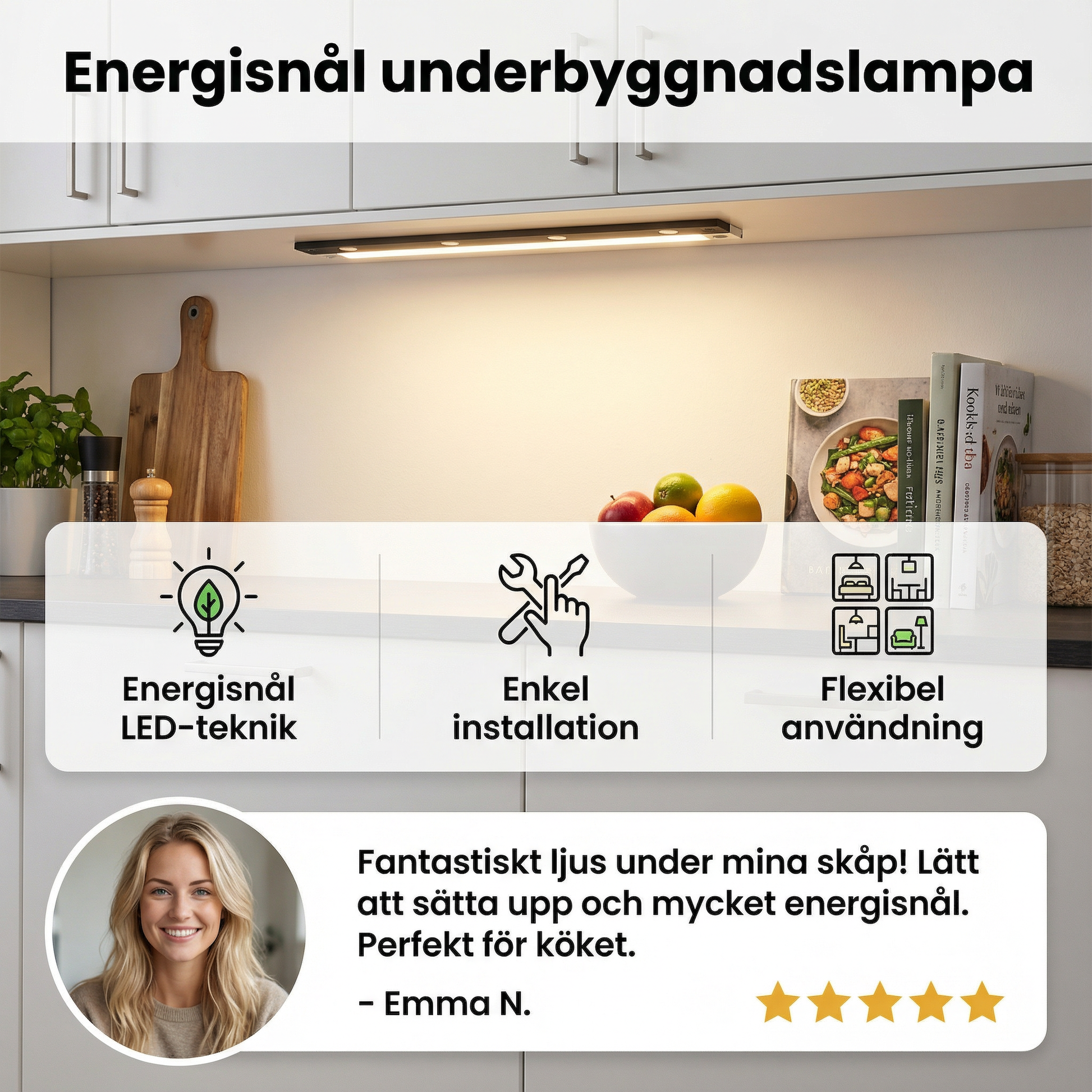 “Lampan ger ett behagligt ljus och tänds precis när man behöver den. Installationen gick snabbt och den passar perfekt under köksskåpen. Jag märker tydligt att den både är praktisk och sparar energi i vardagen.”