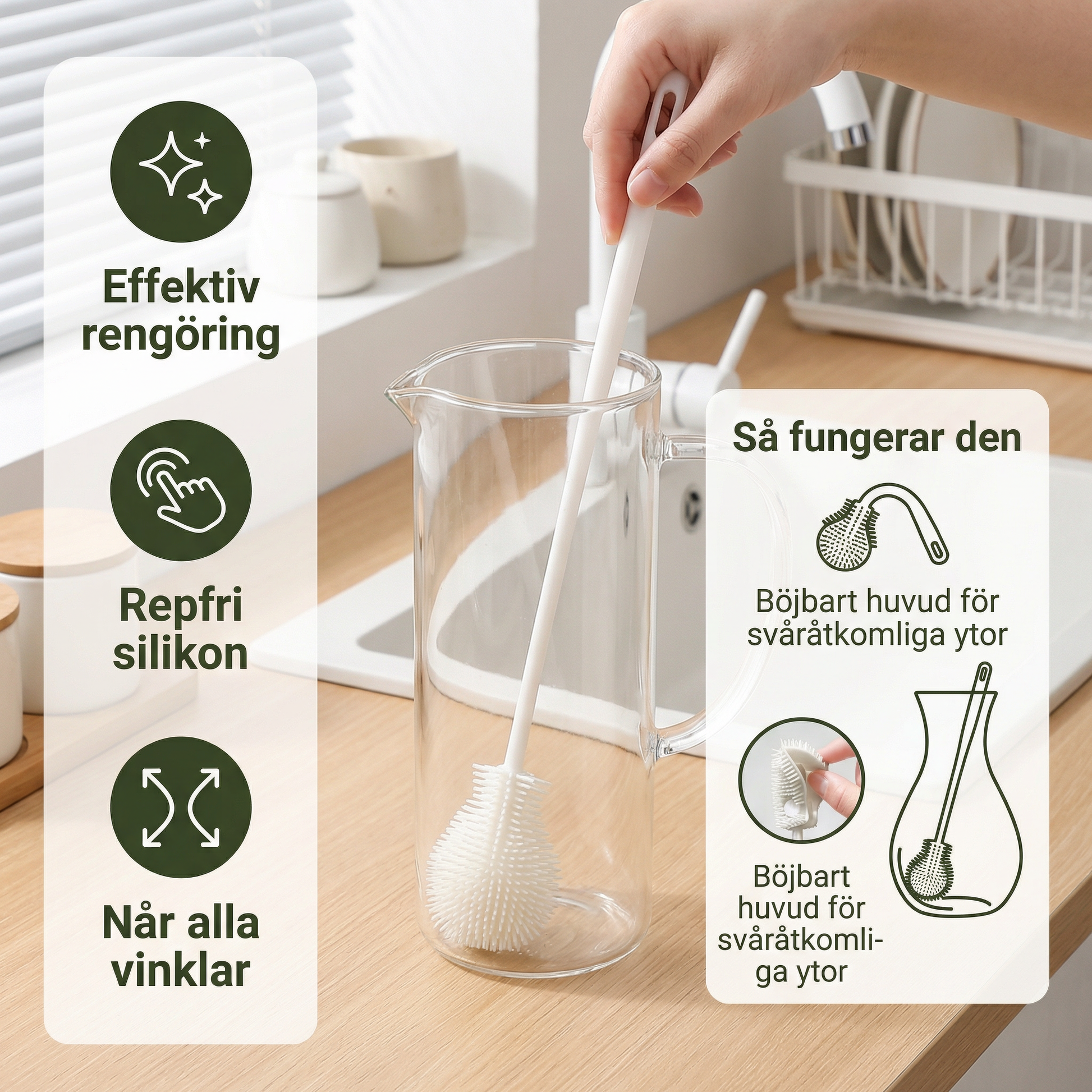 “Jag använder borsten dagligen till både vattenflaskor och nappflaskor. Den når verkligen överallt och gör rengöringen mycket snabbare än vanliga borstar. Känns stabil, hygienisk och väldigt smidig i vardagen.”