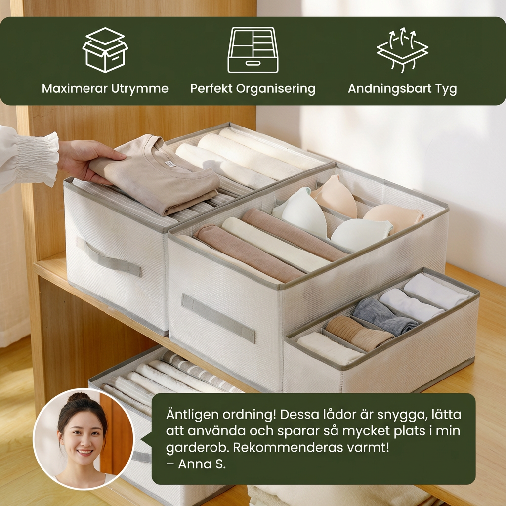“Den vikbara klädförvaringslådan med fack har hjälpt mig att äntligen organisera min garderob ordentligt. Särskilt praktiskt tycker jag är fackindelningen, som gör att jag kan sortera mina kläder efter kategori och alltid hitta dem snabbt!”