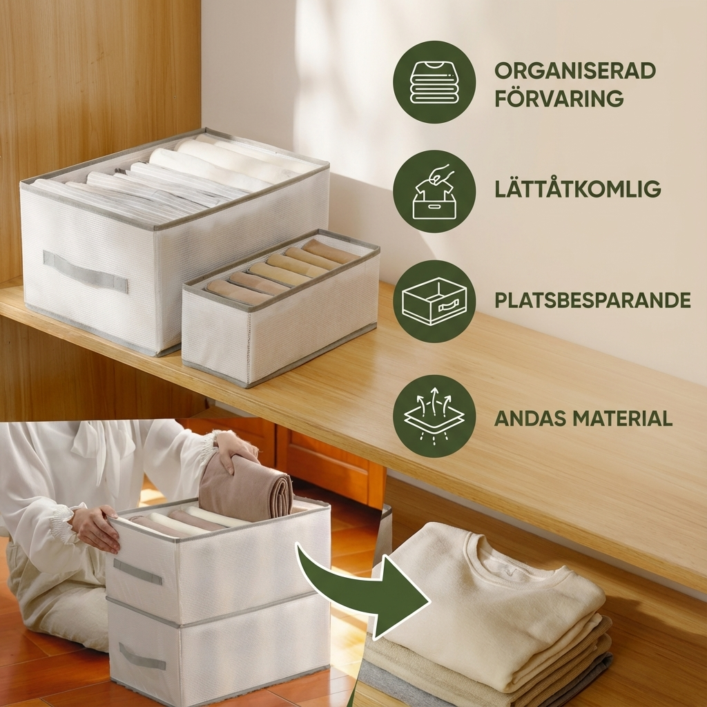 Skapa nu struktur och översikt i ditt hem med den vikbara klädförvaringslådan med fack. Perfekt för alla som älskar ett städat, stilfullt hem. Enkel att använda, enkel att förvara – och kaoset har ingen chans längre!