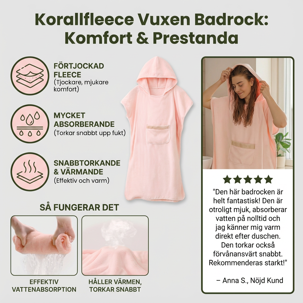 Huvas storlek är perfekt och ger extra värme efter badet. Korallfleecen känns lyxig trots rimligt pris.