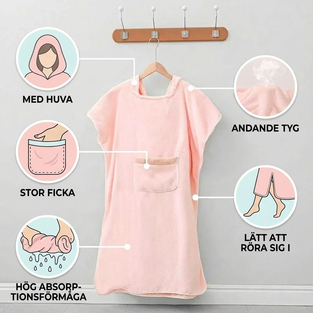 “Den praktiska badrocken är supermjuk och absorberande, så att jag snabbt torkar efter duschen. Ponchodesignen gör den extra lätt att ta på och ger mycket rörelsefrihet – perfekt även för stranden.”