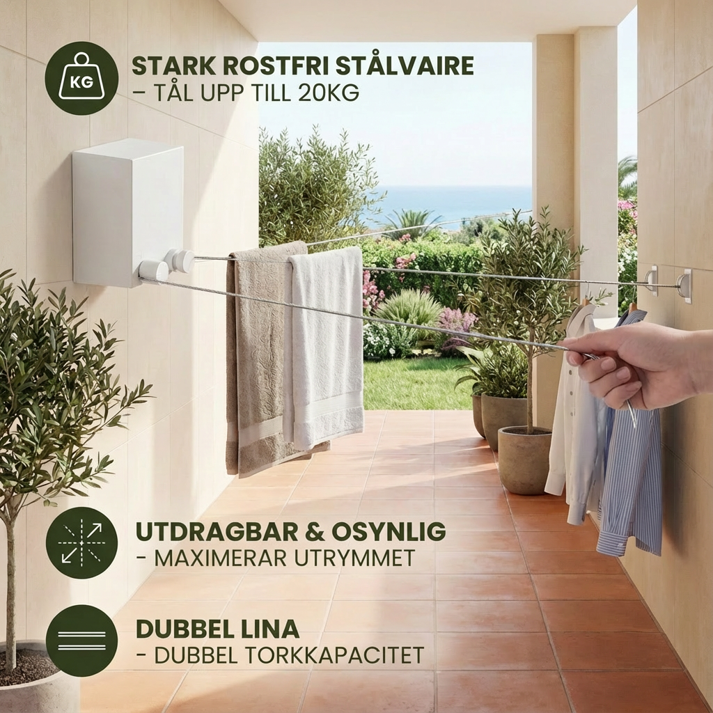 Med den praktiska utdragbara tvättlinan får du ordning och flexibilitet i ditt hem. Den är lätt att montera och ger dig precis den längd du behöver för att torka din tvätt effektivt. Perfekt för små lägenheter, badrum eller som extra torkmöjlighet utomhus.