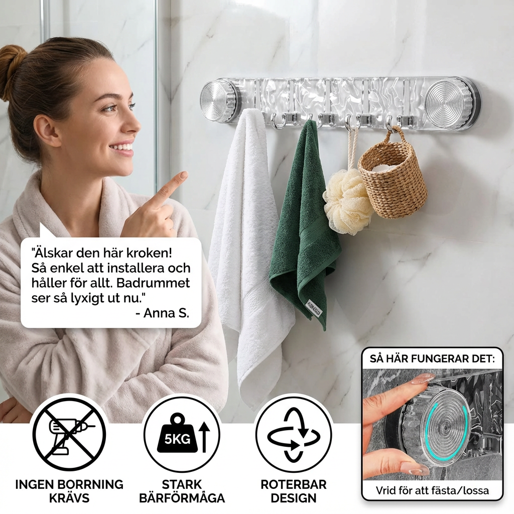 “Sugproppskrokarna är superenkla att sätta upp och sitter verkligen stadigt, även i det fuktiga badrummet. Äntligen har jag en praktisk lösning för att förvara mina smycken och hårsnoddar prydligt, utan att behöva borra hål i väggen!”