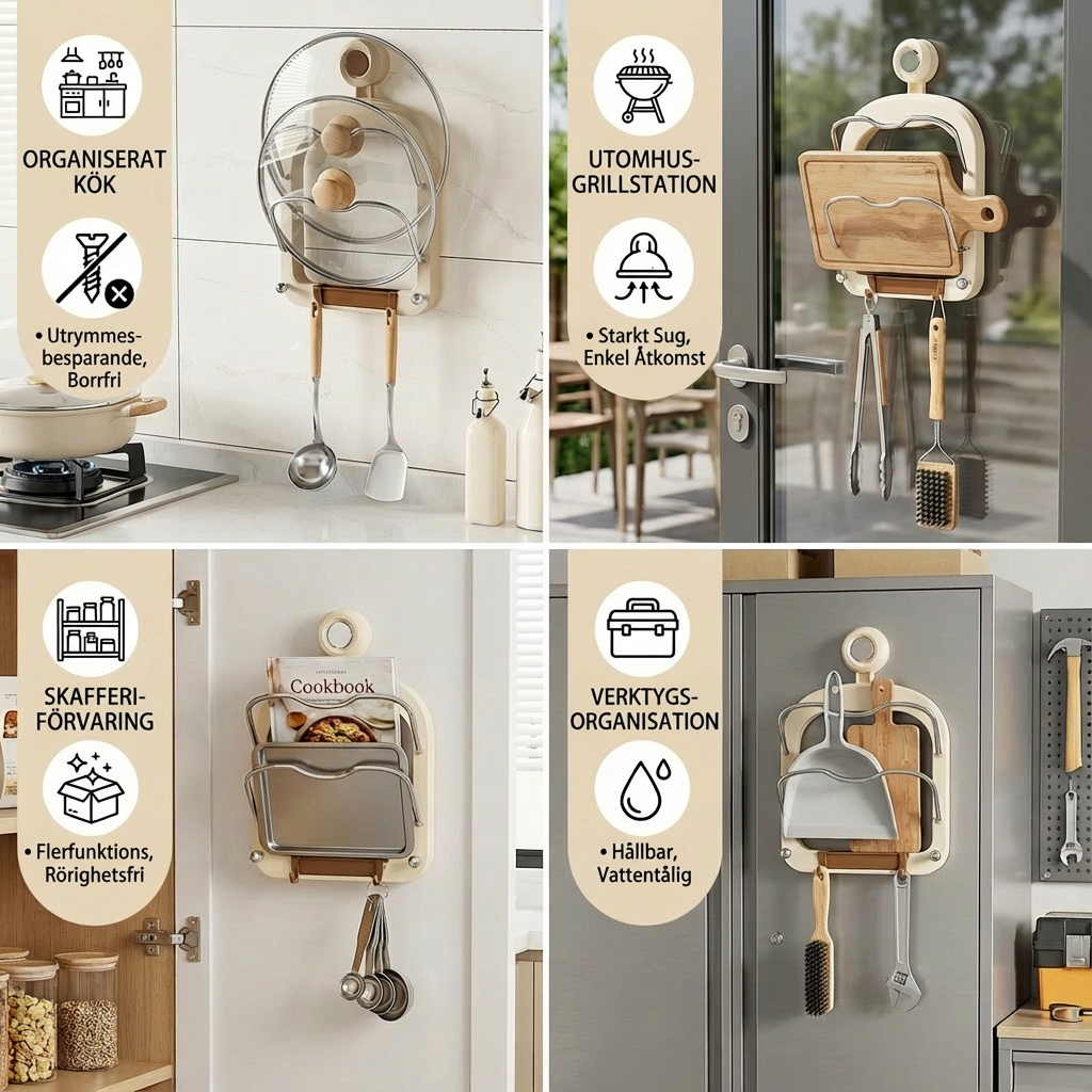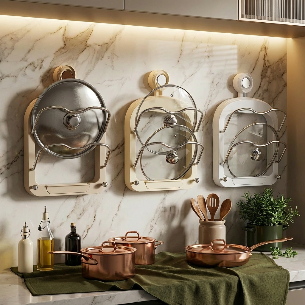 Denna praktiska lockhållare är den perfekta lösningen för att göra ditt kök mer effektivt och organiserat. Slut på kaos och lång tid av att leta efter rätt lock. Med denna hållare har du alltid alla dina kastrullock lättillgängliga och prydligt förvarade.