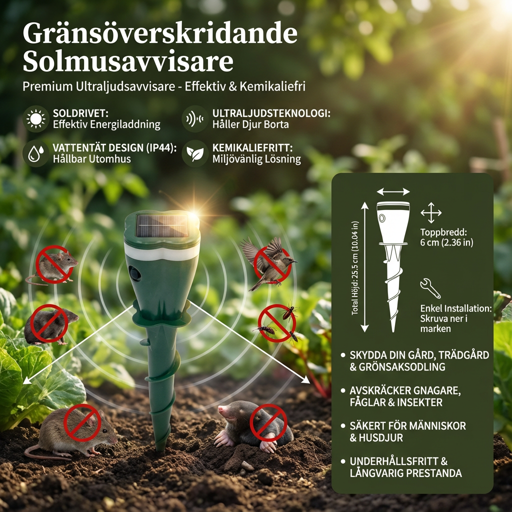 Skydda ditt hem och din trädgård på ett miljövänligt sätt med solultraljuds djur- och insektsavvisare. Denna innovativa enhet använder solenergi för att hålla störande djur och insekter borta med ultraljudsvågor – helt utan kemikalier. Perfekt för trädgårdsägare, djurälskare och alla som söker en hållbar lösning för att hålla sin omgivning säker och fri från oönskade besökare.