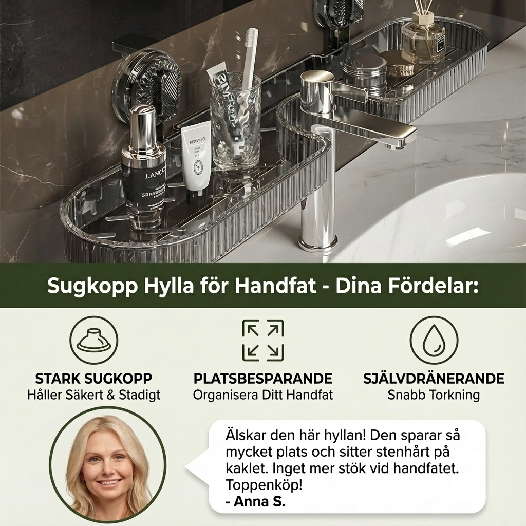 “Sugkopp Hyllan För Handfat sitter mycket stadigt och har samtidigt ett modernt utseende. Det är särskilt praktiskt att jag nu har mer plats vid handfatet och att allt är snyggt och prydligt förvarat.”