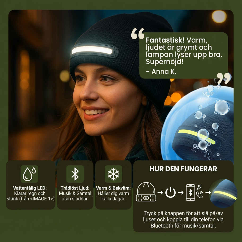 “Mössan är otroligt bekväm och håller riktigt varmt i kallt väder. Jag tycker det är särskilt praktiskt att jag kan lyssna på musik utan extra enheter, och att LED-ljusslingan gör mig mycket mer synlig under kvällspromenader.”